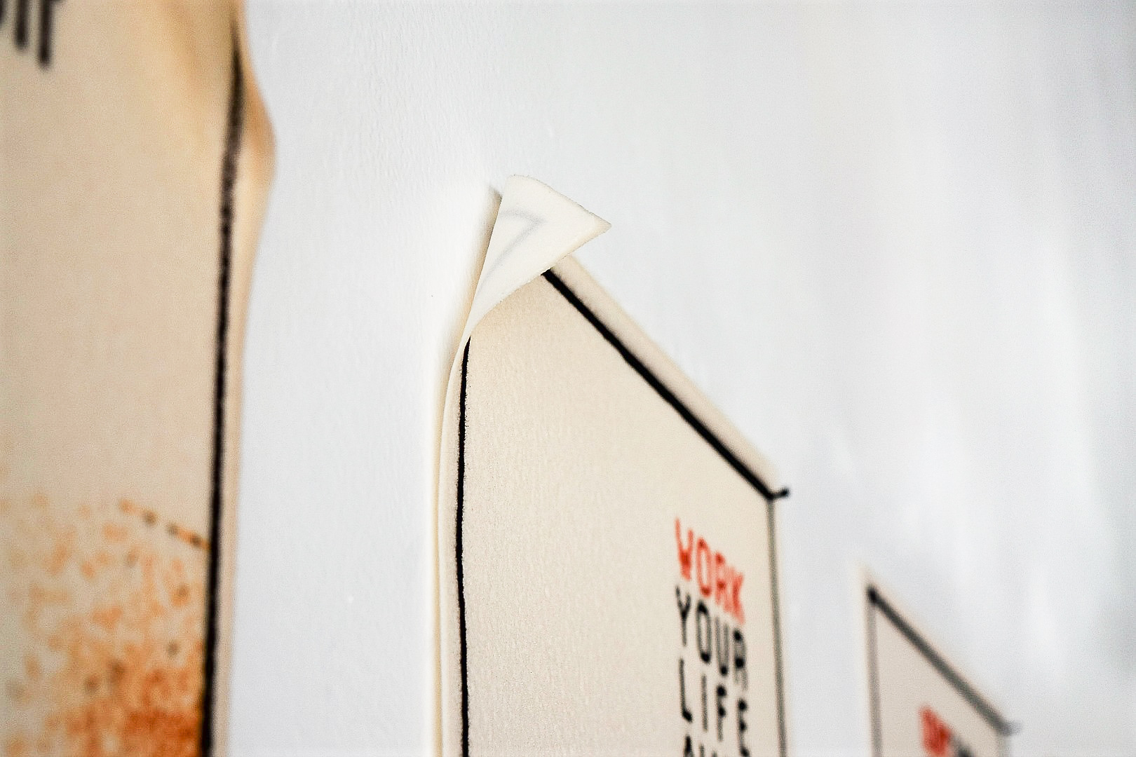 Art piece "Something" in 2018 by Alise Stopina. Paper colored eight glass powder with printed satirical quotes and images related to quotes.